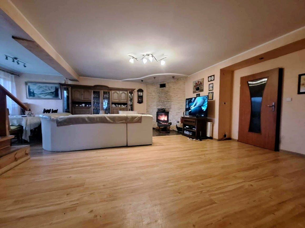 Dom, to ok. 378m2 ( 5 Pokoi ) kryty dachówką ceramiczną. Niestandardowy układ pomieszczeń, z dużym salonem gościnnym z kominkiem, trzema łazienkami oraz dużym apartamentem na poddaszu ( do wykończenia ). Spiżarnia, pralnia, piwnica, kotłownia z piecem na pellet. W cenie domu może pozostać kompletne wyposażenie.